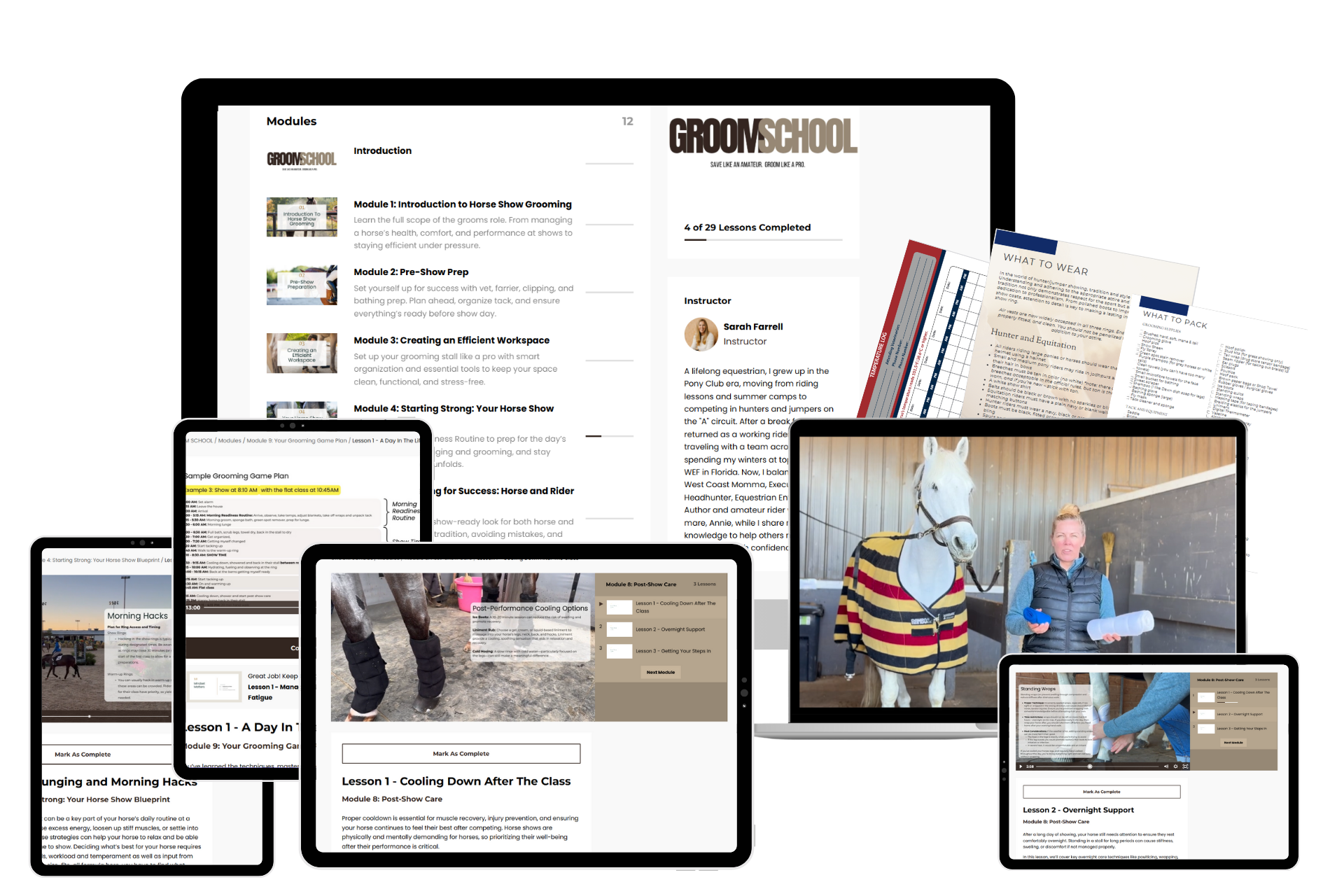 Groom School is a self-paced online course with 10 modules (29 videos total) that walk you through every single stage of the horse show experience.